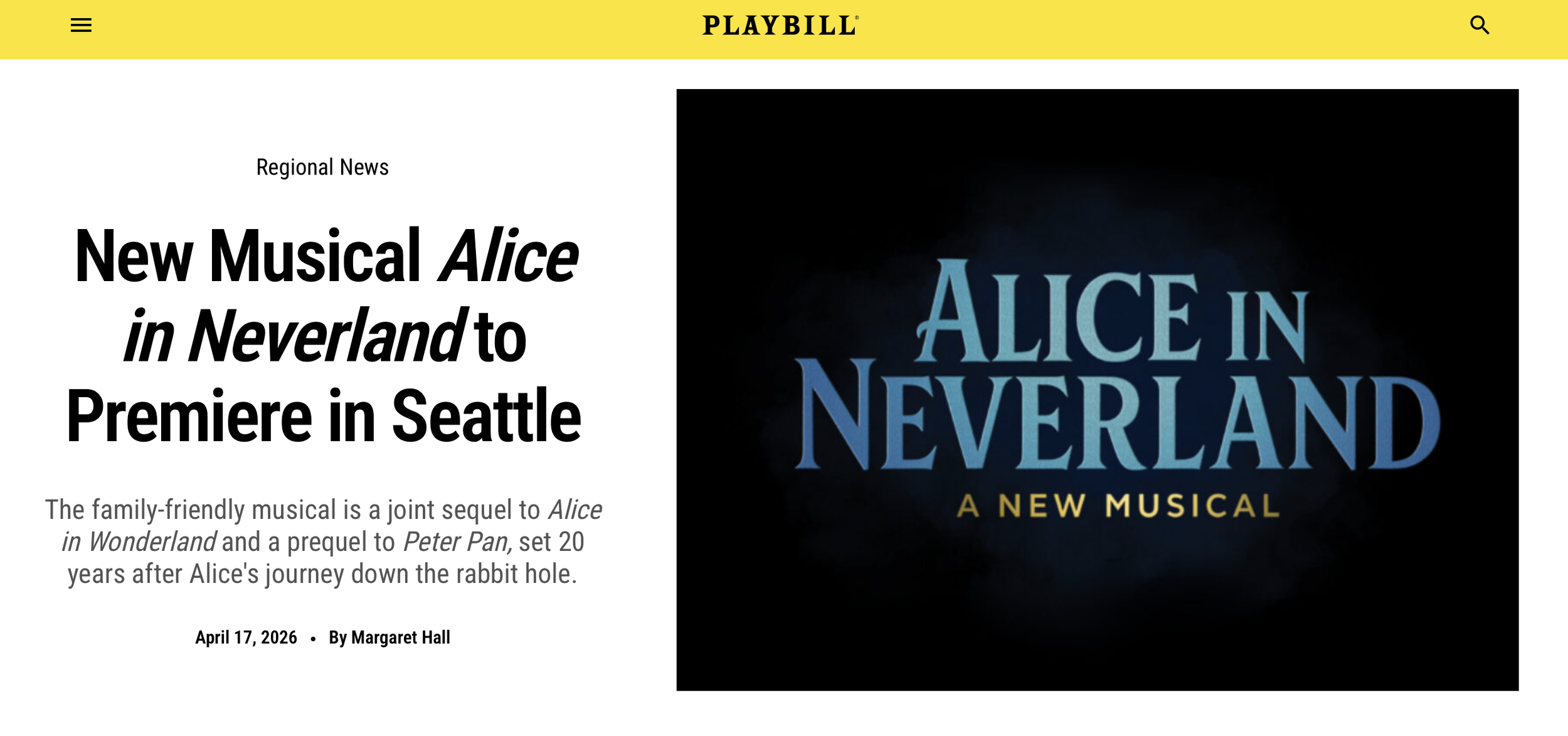 4/17/26 - More exciting news about Alice in Neverland! Thrilled to be premiering this new musical as a co-production between The Alliance and The 5th Avenue Theatre!